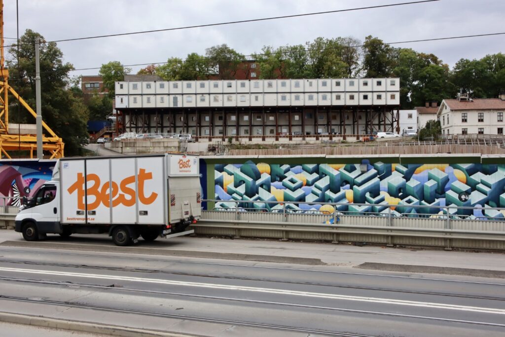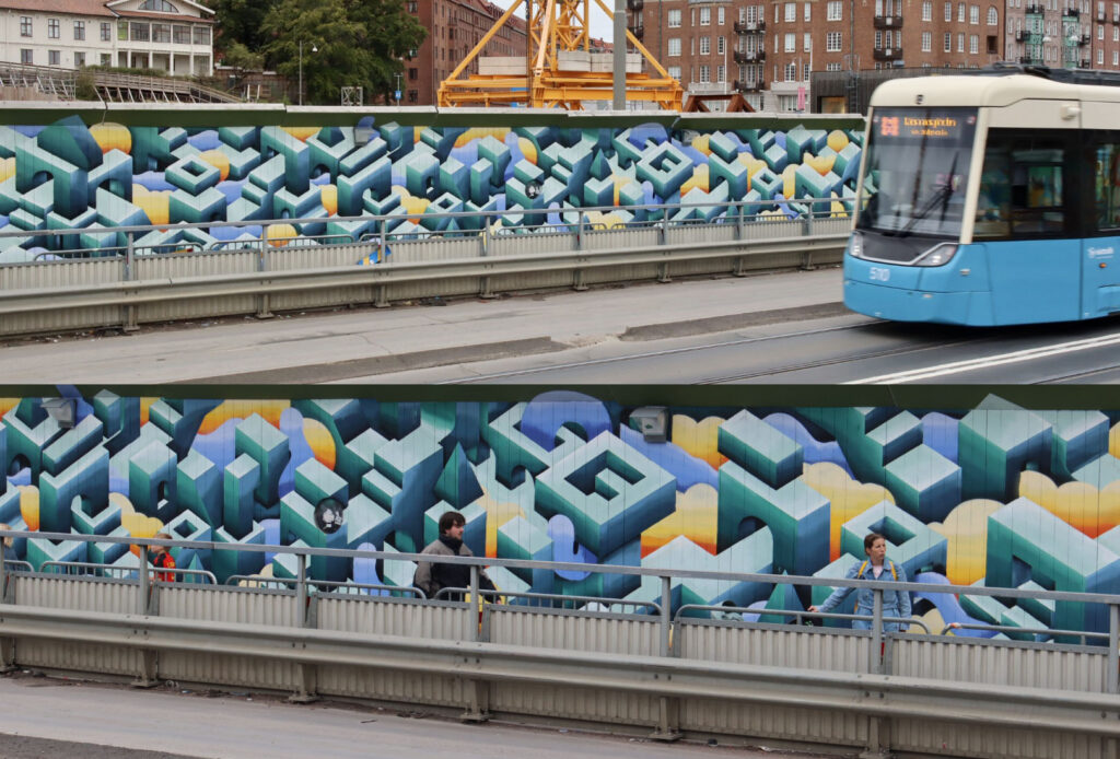 The artist developed a mental map of Gothenburg, integrating architectural elements and abstract forms to evoke the dynamics of transport and city life. The work was part of a long-term initiative involving several kilometers of painting surfaces along the city’s transport lines, where around fifty artists contribute to large-scale murals over multiple years.