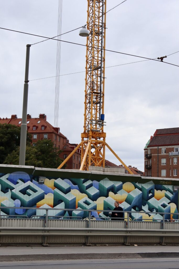 Takir a conçu une carte mentale de Göteborg, intégrant des éléments architecturaux et des formes abstraites pour traduire visuellement la dynamique du transport et de la vie urbaine. L’œuvre s’inscrit dans un projet de longue durée : plusieurs kilomètres de palissades le long des lignes de transport sont destinés à être peints par une cinquantaine d’artistes sur plusieurs années.