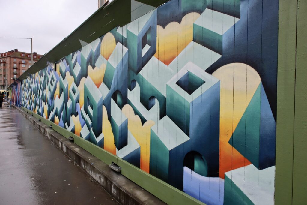 Cette fresque, intitulée Gravitational Geometry, a été réalisée par l’artiste Takir en collaboration avec la société de transport de Göteborg. Le projet s’inspire des labyrinthes urbains, de la mobilité et des flux de circulation dans la ville.